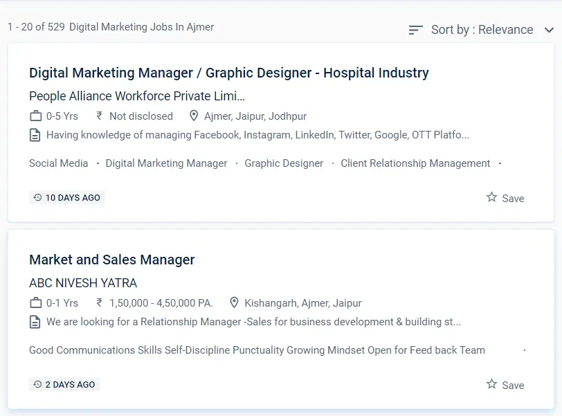 As you can see in this screenshot, around 500 digital marketing jobs are currently available in Ajmer. We have included a screenshot from just one website. If you check on all, there are plenty of jobs available.