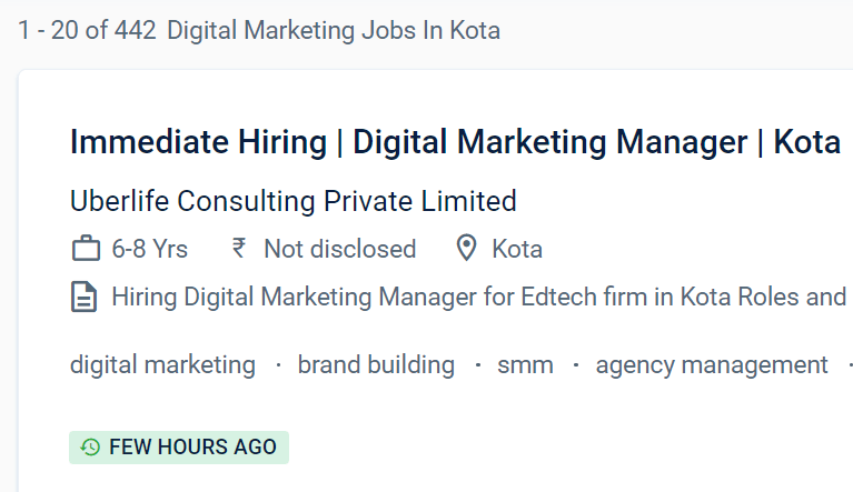 As you can see in this screenshot, around 443 digital marketing jobs are currently available in Kota. We have included a screenshot from just one website. If you check on all, there are plenty of jobs available.